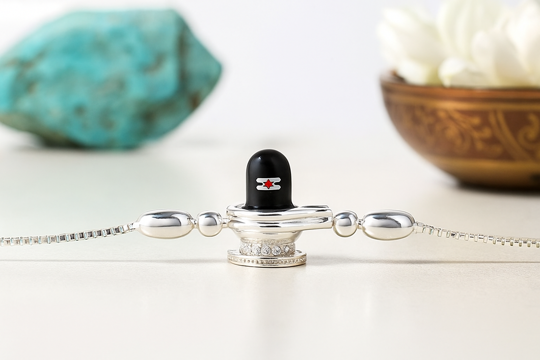 This 925 Sterling Lord Shivling Silver Rakhi. The centerpiece features a finely detailed Shivling, symbolizing...