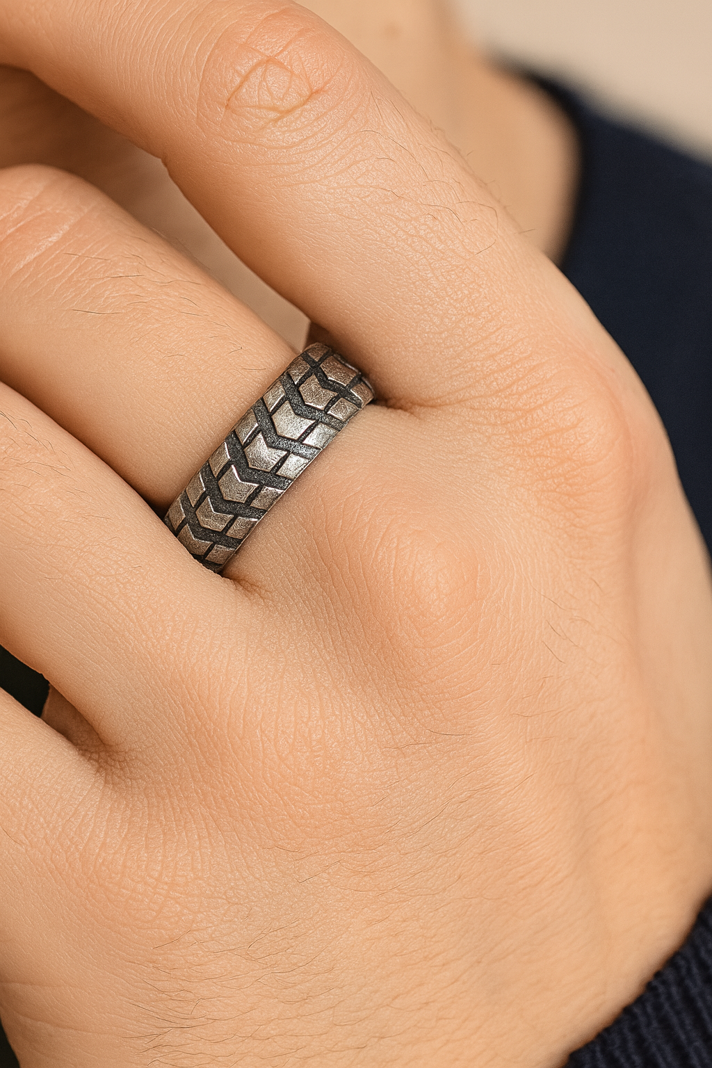This stylish silver band features a bold chevron-patterned texture that wraps seamlessly around the ring. Crafted with precision, it offers a masculine yet minimal appeal, making it perfect for daily wear.