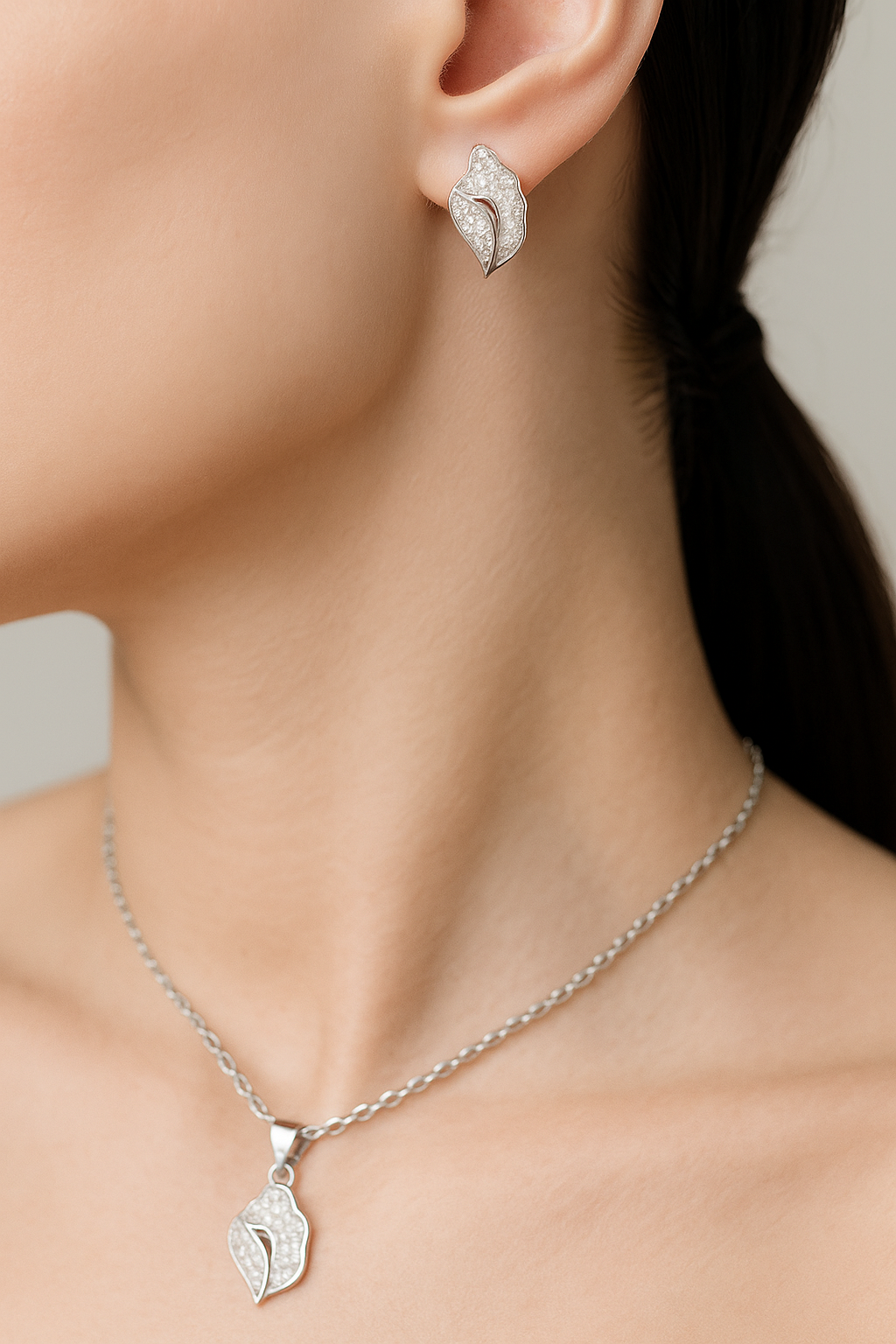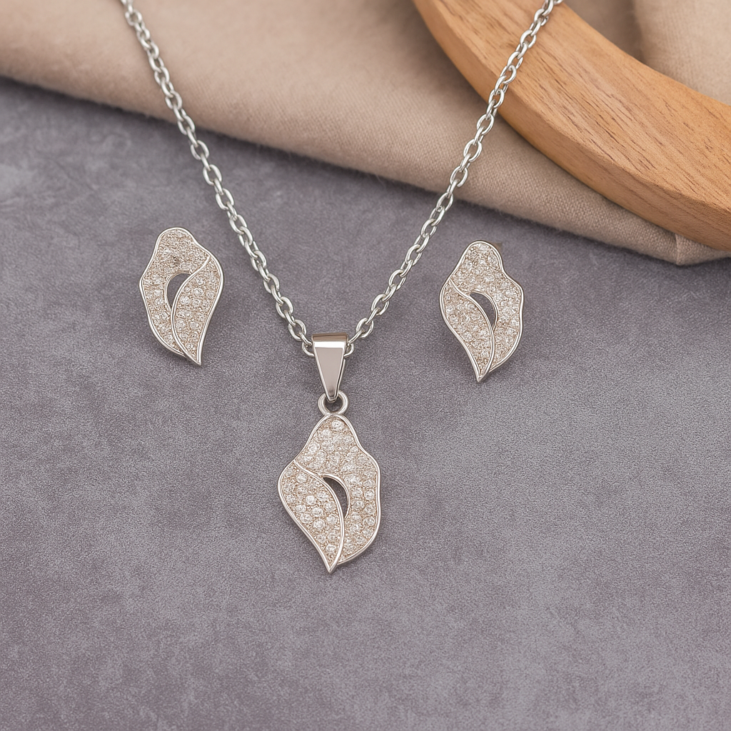 This Beautiful 925 Sterling Silver Crystal Bloom Pendant Set. A floral pendant in silver with small diamond or gemstone accents, representing divine beauty.