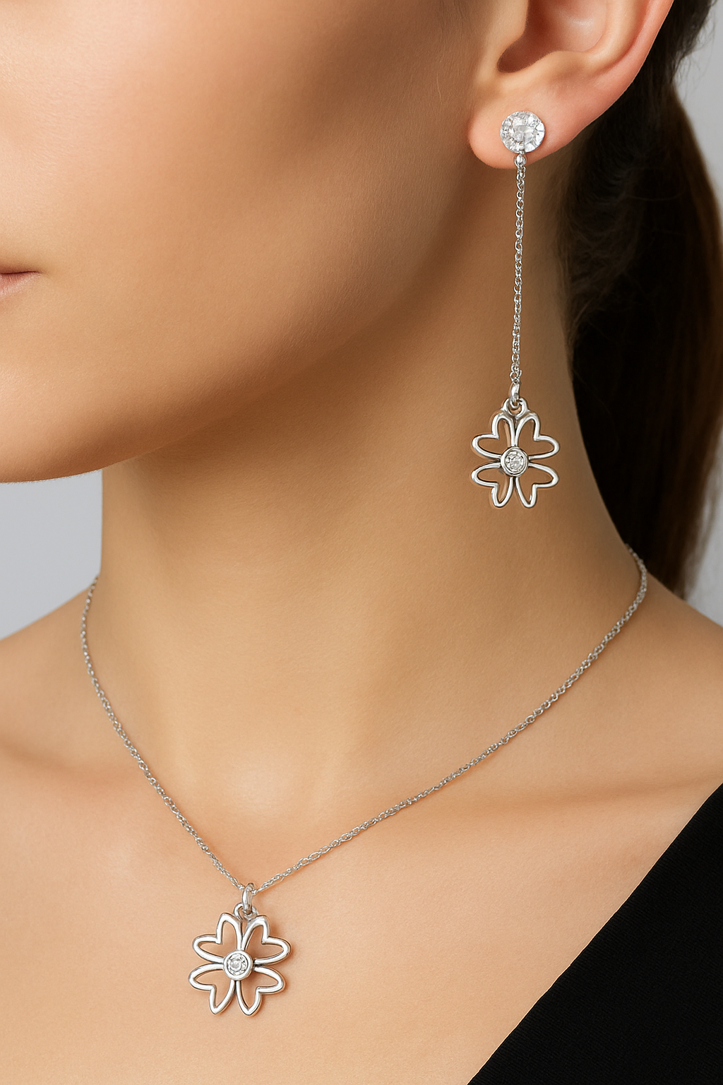This Beautiful 925 Sterling Silver Heavenly Blossom Pendant Set. A floral pendant in gold or silver with small diamond or gemstone accents, representing divine beauty.